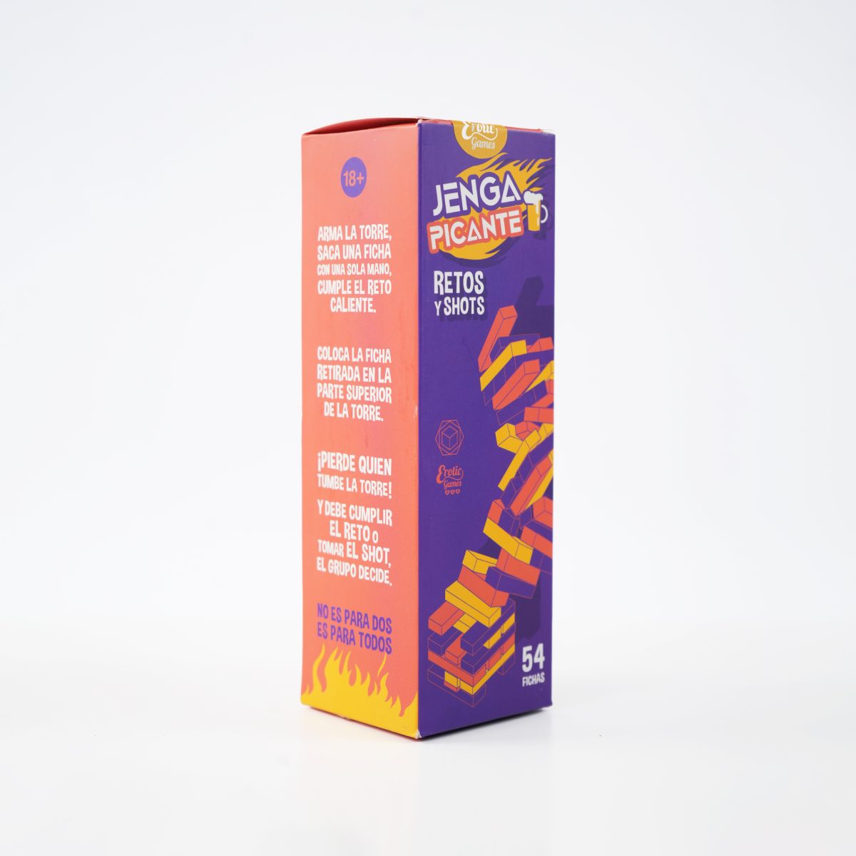 Jenga Picantees el juego perfecto para encender la noche con amigos. Con 54 fichas llenas de retos calientes y desafíos que te harán reír, sonrojarte y tomar uno que otro shot, este juego no es para tímidos… ¡es para valientes!